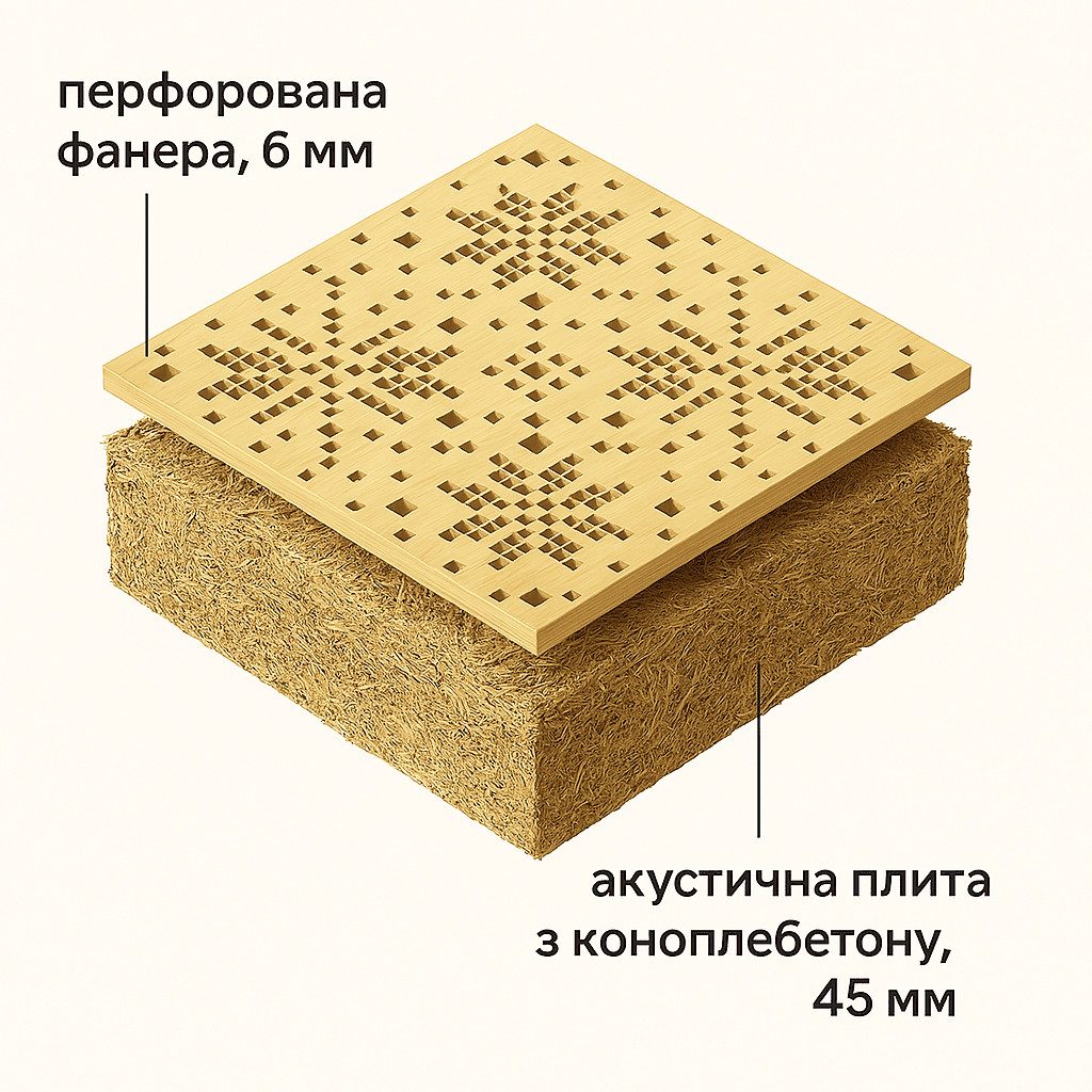 Склад: натуральний коноплебетон з високими звукопоглинальними властивостями, парферована фанера.