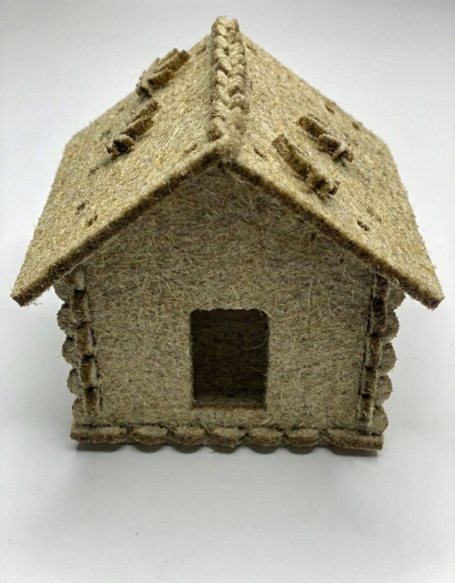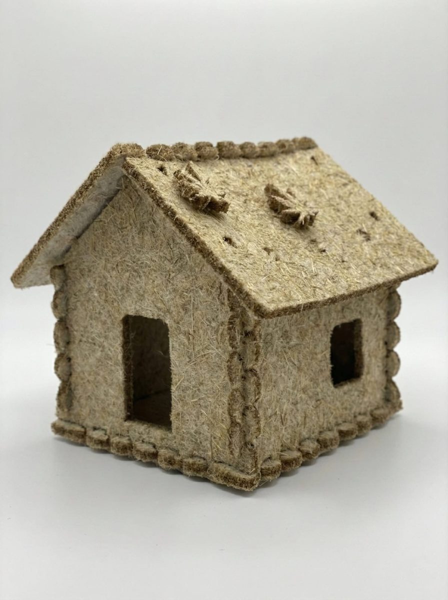 Еко-декор з конопляного волокна у формі будиночка створює відчуття затишку та тепла ручної роботи. Натуральна фактура, прості форми й легкість матеріалу роблять його ідеальним акцентом для святкового інтер’єру або сезонної композиції. Підійде як самостійний декор чи елемент зимової сцени.